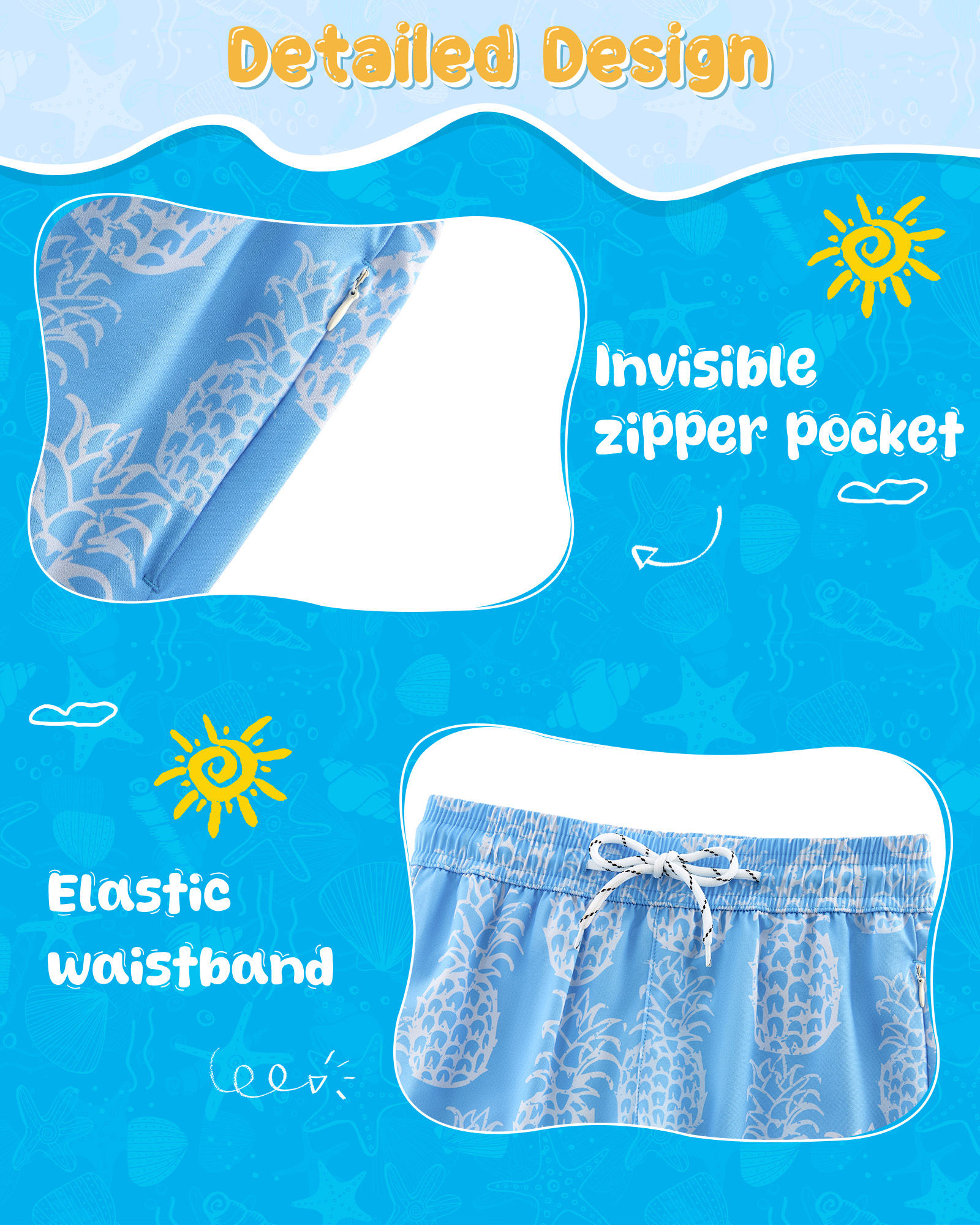 • Practical & Secure Design: Featuring a discreet side zipper pocket for essentials and an elastic drawstring waist, these boys board shorts offer a customized, secure fit that moves with them.