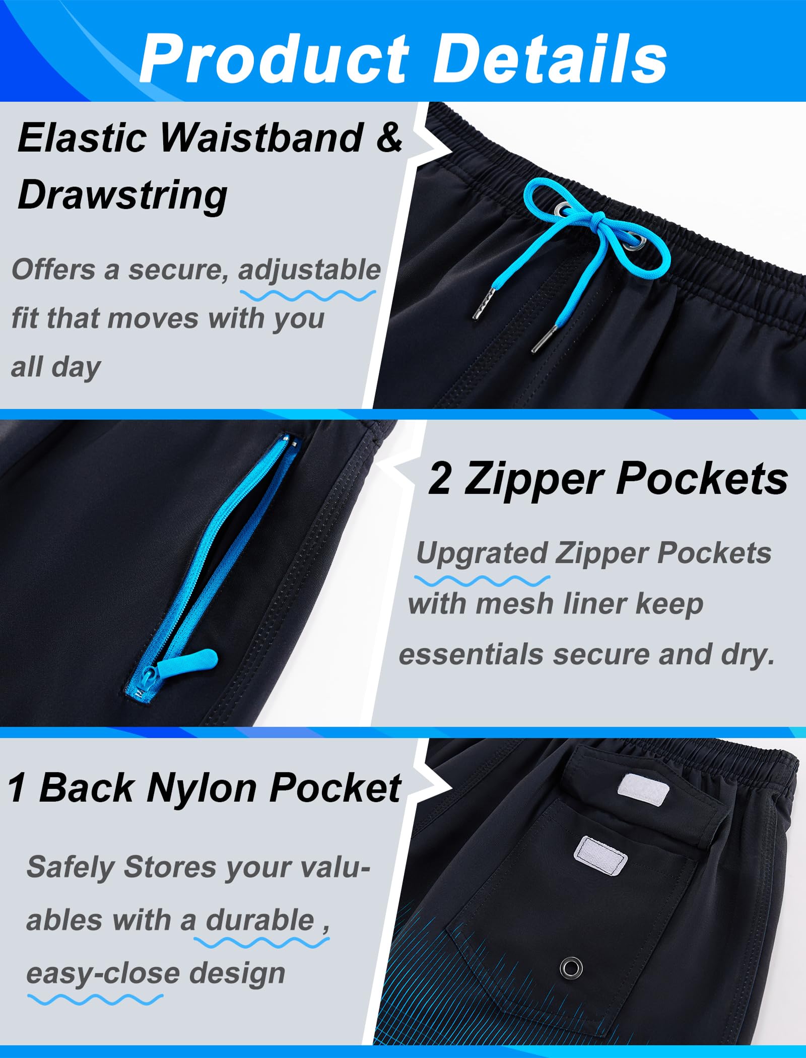 • Zipper Pockets for Secure Storage — This men’s swimwear comes equipped with zippered side pockets to keep your phone, keys, or wallet safe while you’re swimming, running, or just relaxing by the pool.