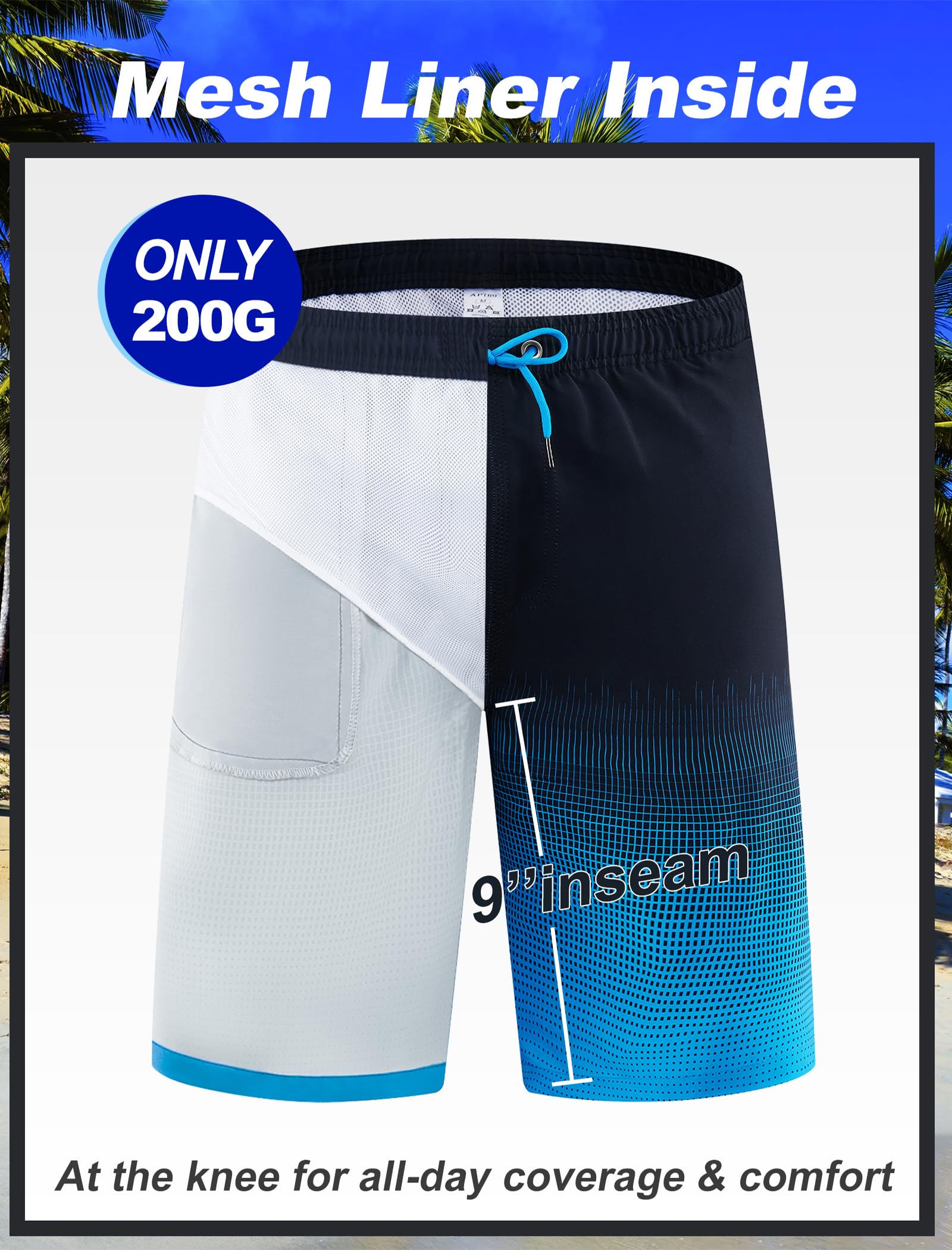 • Mesh Lining for Comfort and Support —These men’s swimming shorts include a built-in mesh liner that offers soft support and helps prevent chafing, so you can stay comfortable during long days in and out of the water.