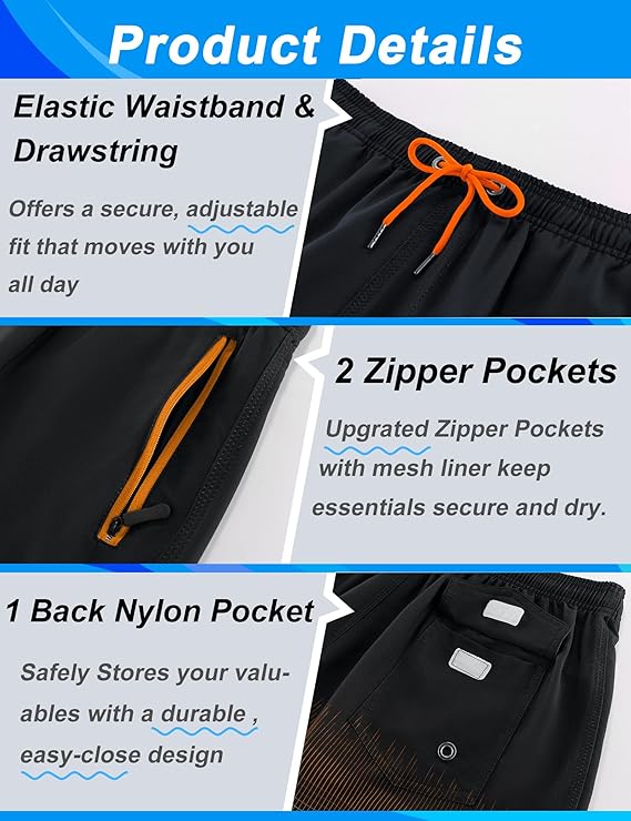 • Zipper Pockets for Secure Storage — This men’s swimwear comes equipped with zippered side pockets to keep your phone, keys, or wallet safe while you’re swimming, running, or just relaxing by the pool.