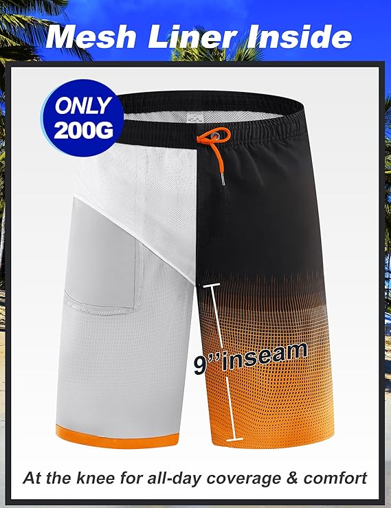 • Mesh Lining for Comfort and Support —These men’s swimming shorts include a built-in mesh liner that offers soft support and helps prevent chafing, so you can stay comfortable during long days in and out of the water.