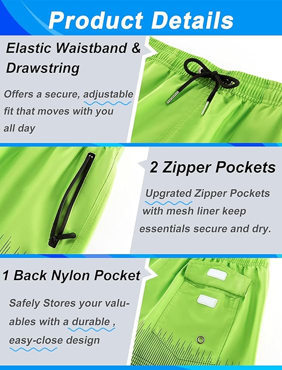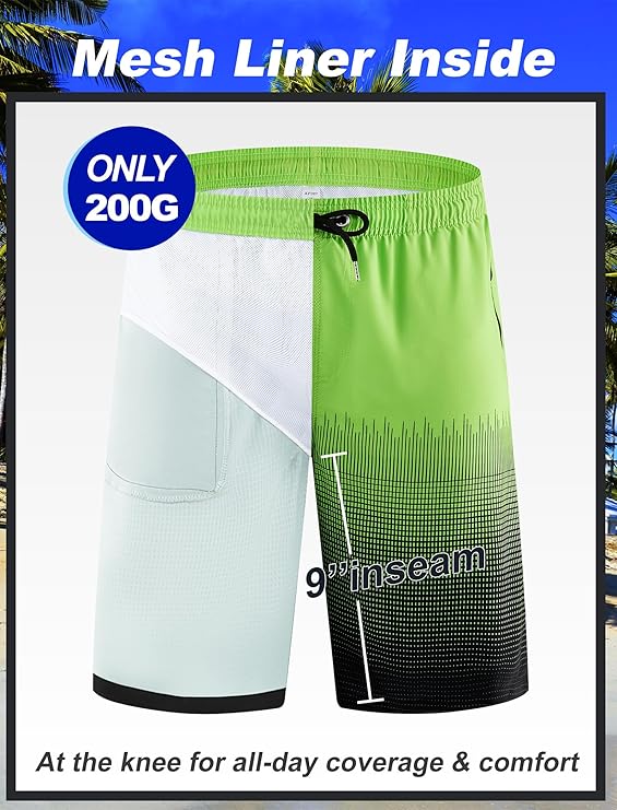 • Mesh Lining for Comfort and Support —These men’s swimming shorts include a built-in mesh liner that offers soft support and helps prevent chafing, so you can stay comfortable during long days in and out of the water.