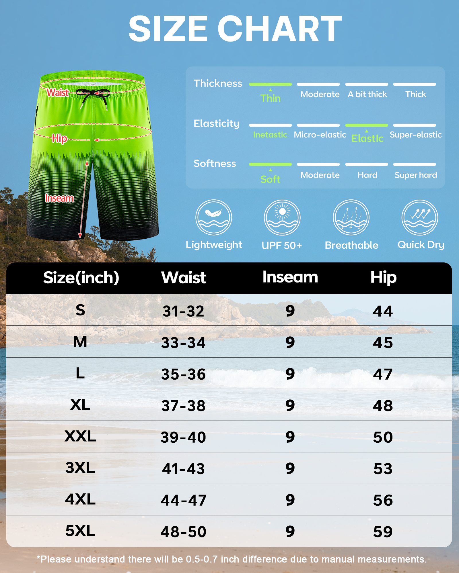 • Classic Fit with Adjustable Waistband —Our swim pants feature a 9″ inseam that hits right above the knee, plus an adjustable drawstring for a secure, comfortable fit—perfect for swimming, hiking, or laid-back weekends.